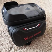 “This works great on my bike. The two side pockets are great for small bike tools and my small wallet. The plastic screen over the phone works great. I have no issues using my phone. It keeps my phone dry and safe.”