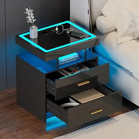 Here’s a rewritten product description based on the provided HTML content: — Discover the Smart Nightstands, a bedside table designed with a human body sensing system that automatically illuminates when you approach, eliminating the need to fumble in the dark. After 30 seconds, the light gently fades away. Equipped with super-quiet slides, these nightstands ensure a peaceful night’s sleep without disturbing your partner. This 3-in-1 charging station is perfect for powering up your devices. It features a built-in wireless charger, USB port, and Type-C port, allowing you to charge phones, tablets, and lamps simultaneously, all within easy reach. The modern nightstand boasts a 3-color LED light with adjustable brightness. Choose from blue, warm yellow, or white light to set the mood for movie nights, romantic evenings, or cozy Sundays. With just a press of a button, you can adjust the light modes and brightness, transforming your room in seconds. Enjoy ample storage space with this LED nightstand, which includes two drawers for storing alarm clocks, magazines, and other essentials within arm’s reach. It’s perfect as a living room end table next to your sofa or as a modern nightstand in your bedroom. The dimensions are 15.7″ in depth, 19.6″ in width, and 22.8″ in height. Made from durable, scratch-resistant MDF with a glossy finish, this LED nightstand is built to last. It features a glass top and comes with step-by-step instructions and dedicated support for your convenience. — This description maintains the key features and benefits of the product while rephrasing the original text.