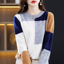 Woman's Sweaters Autumn Winter Fashion Patchwork Casual Coats Female Pullover Long Sleeve O-Neck Jumper 100% Wool Knitted Tops